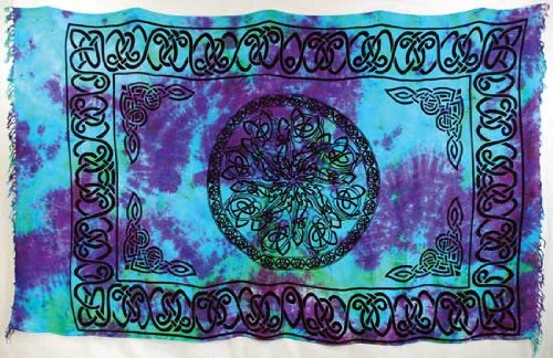 A wonderful piece intended to be worn as a sarong (but easily serving as an altar cloth or wall hanging), this 100% rayon tie-dye sarong has been decorated with an intricate pattern of knot work that forms a mesmerizing mandala. With a fringe accenting its outer edge, the intricate and dazzlingly pattern created within the mandala is only enhanced by the blue and purple tones that fade and blend within the tie-dyed cloth. The whole piece measures approximately 44" by 72"